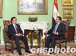 當地時間一月二十九日,中國國家主席胡錦濤抵達開羅,開始對埃及進行國事訪問。圖為胡錦濤與埃及總統穆巴拉克舉行會談。中新社記者齊彬/攝