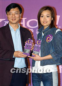 歌星容祖兒2月5日在香港出席《Yahoo!感情品牌大獎2003-2004》頒獎典禮,她分別為“日清食品”及化妝品牌“~H2O+”代言獲獎,雅虎香港總經(jīng)理蔡寶德先生頒發(fā)兩個“感情品牌代言人”獎項予容祖兒。作者:鄧慶樂