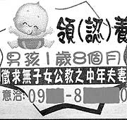最近在臺中地區有一則夾報小廣告,登載者希望尋找沒有子女的中年公務員,收養他一歲八個月大的幼兒,廣告上留有行動電話,由于春節前后類似的廣告有多起,引人注意,有多人打電話詢問對方原因,關心小孩處境。