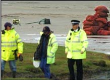 圖:英國警察站在英格蘭西北部莫克姆灣海灘(2月7日11:50)
