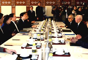 由香港政務司司長曾蔭權領導的政制發展專責小組二月九日下午,在北京釣魚臺國賓館與許崇德等內地法律專家會面。中新社記者:鄭萍萍