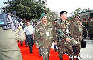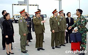 經(jīng)2個小時的機場安檢和苦候,一眾被機場大風吹得瑟縮發(fā)抖的記者已開始露出疲態(tài),但隨著飛機艙門打開,第二個走出機艙的武官形象卻著實令記者大吃一驚,只見一個帶著鋼鐵頭架的西方軍人緩緩步下樓梯,行動笨拙,十足一個航天員模樣,大家還以為是航天員呢。