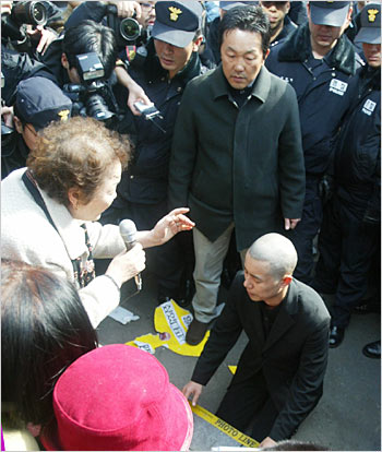 從上午11時30分起,8名慰安婦和30名韓國婦女團體成員在該娛樂公司總部前舉行示威,要求李成延和公司負責人直接道歉。下午1時30分,抗議者表示“要讓公司負責人道歉”,并試圖闖進公司。此時,樸智友來到眾人前,朗讀道歉聲明,并跪在慰安婦老人面前表示歉意。