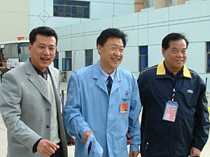 中國工程院院士、中國載人航天工程總設計師王永志(中)與“神舟”五號載人飛船總指揮袁家軍、“神箭”——“長征二號F”運載火箭總指揮黃春平在一起