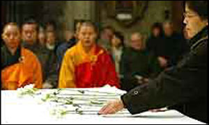 悼念儀式的參加者獻(xiàn)上白色的康乃馨花(英國廣播公司圖)