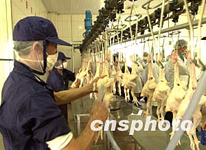 澳門(mén)特區(qū)民政總署和珠海出入境檢驗(yàn)檢疫局一日在珠海舉行會(huì)議,就恢復(fù)因禽流感而中斷的活雞輸入問(wèn)題進(jìn)行協(xié)商并達(dá)成共識(shí),雙方?jīng)Q定報(bào)國(guó)家有關(guān)部門(mén)批準(zhǔn)后,從三月五日起同步恢復(fù)活雞、冰鮮雞、和凍雞的供應(yīng)。圖為在為澳門(mén)進(jìn)行活雞加工的珠海科泰有限公司畜禽食品廠的活雞加工生產(chǎn)在線,工人們對(duì)宰殺后的雞只進(jìn)行認(rèn)真的清洗。中新社傳真 李剛 攝