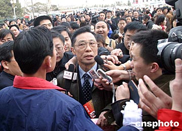 下午二點(diǎn)多,距全國政協(xié)十屆二次會議開幕尚有半個小時,但人民大會堂前已聚滿海內(nèi)外記者,各路英雄架起長槍短炮,敬候“獵物”。