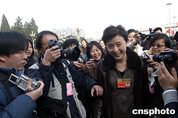 三月三日,全國政協(xié)十屆二次會議在北京召開,全國政協(xié)委員楊瀾成為記者追逐采訪的對象。中新社記者:張勤