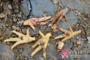 3月6日,廣西檢驗檢疫局組織人員,兵分兩路,一路查看現場證實確有人動過雞爪后,將現場作了消毒和封鎖;另一路與公安部門一起向舉報者了解情況。