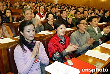 全國政協十屆二次會議三月十二日在北京人民大會堂閉幕,宋祖英(左一)、吳玉霞(左二)等委員鼓掌祝賀會議成功。中新社記者:毛建軍