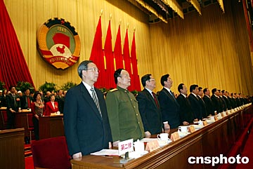 全國政協十屆二次會議十二日在北京人民大會堂閉幕,在主席臺就座的人員全體起立唱國歌。中新社記者:滿會喬