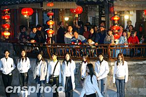 三月十三日晚,參加“古鎮西塘”2004年國際旅游小姐大賽中國區總決賽的三十二名參賽佳麗在西塘古鎮新搭建的水上舞臺排練,吸引了不少觀眾觀看。中新社記者:盛佳鵬