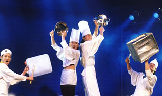 三個些許瘋狂的"廚師"和略帶頑皮的助手正準(zhǔn)備開始一天的工作,搬蔬菜,挪凍肉,整理廚具……主管突然宣布要完成一場盛大的婚宴,在下午6點(diǎn)之前要作完訂單上的菜,還介紹他不懂料理技術(shù)的侄子來幫忙,可是時間非常緊迫,在這樣令人窒息又緊張的時刻,總管當(dāng)然希望所有的準(zhǔn)備工作都能按部就班地照章完成。但是幾個廚師卻如何都統(tǒng)一不起來,又看不順眼總管的侄子,相互敲擊的混亂場面也就由此而生。在傳統(tǒng)表演中使用的打擊樂器被廚房中不同種類的日常廚具所代替,砰砰地敲擊出頗有韻律的節(jié)奏,伴隨著玩耍的歡呼,廚師們用詼諧幽默的肢體動作,把一場烹飪工作演變成戲謔的惡作劇,卻帶給觀眾視覺的沖擊和聽覺的震撼,引得觀眾不由自主地想要參與其中。當(dāng)"廚師們"完成精美的菜肴,表演也進(jìn)而達(dá)到了極致。
