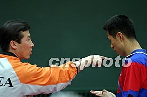 四月十日晚在北京海淀體育館舉行的奧運會乒乓球亞洲區(qū)預選賽中,中國小將王皓以4-1戰(zhàn)勝韓國選手朱世赫。圖為金澤洙在場邊為朱世赫進行現(xiàn)場指導。中新社記者:盛佳鵬
