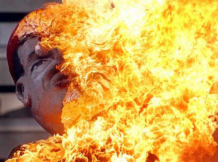圖文:反對者在燃燒委內瑞拉總統查韋斯的肖像