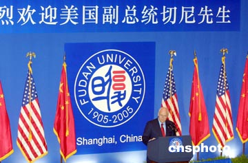中新網(wǎng)4月15日電 來自上海的最新消息說,美國副總統(tǒng)切尼15日上午在復(fù)旦大學(xué)開始演講。