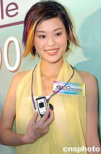 藝員胡杏兒4月16日在香港出席韓國GEO Mobile最新推出的潮流手機GC800發布會,胡杏兒為GEO Mobile代言人,以嶄新彩色駁發形象,與兩位人體彩繪舞蹈員共同展示GC800新手機。作者:鄧慶樂