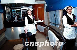 四月十七日晚十八點(diǎn)五十三分,中國鐵路第五次提速開始。新開行的十九對直達(dá)特快列車中,北京開往杭州的Z9次首先發(fā)車。圖為新提速火車的餐車酒吧、茶吧寬敞舒適,旅客還可以要求送餐、點(diǎn)餐服務(wù)。