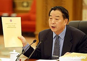 喬曉陽在委員長會上展示《關于香港特別行政區2007年行政長官和2008年立法會產生辦法是否需要修改的報告》以及相關文件。中新社記者:毛建軍