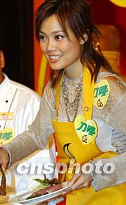 四月十九日,香港一商家舉行產品促銷活動,為商家作電視廣告并唱主題歌的歌星容祖兒在活動上展示廚藝。中新社記者:錢興強