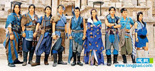 中新網(wǎng)4月22日電 據(jù)香港成報(bào)報(bào)道,九位百事巨星云集安曼古城,各自穿上古裝一字排開(kāi),氣勢(shì)十足。站在中央的依然是百事老大哥郭富城,天后鄭秀文站在他身旁,F(xiàn)4的少俠打扮各有特色,cool味十足,而周杰倫與蔡依林被陳冠希分隔開(kāi)。九人的造型都是以藍(lán)色為主,周杰倫還扎上長(zhǎng)辨,令人甚為新鮮。