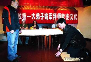 正式的拜師儀式簡短、熱烈,擲地有聲的三叩首表達了徒弟歸于師父門下的誠意,隨后,師徒二人互贈紀(jì)念品,徒弟將金畫《雄鷹展翅》贈予師父,而師父則將自己的小品專輯以及電視劇《正月里來是新春》的光碟回贈給徒弟,目的是希望他今后堅持演文明戲,演有尊嚴(yán)、有人格的作品,做一個德藝雙馨的藝人。