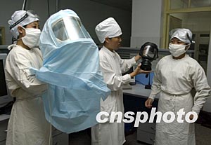 北京地壇醫(yī)院重癥監(jiān)護(hù)室(ICU)的護(hù)士,穿戴好防護(hù)裝準(zhǔn)備進(jìn)入收治SARS疑似患者的病房。地壇醫(yī)院是北京市權(quán)威的老資格傳染病醫(yī)院,在2003年承擔(dān)了眾多SARS患者的治療搶救重任,并在2003年8月將去年全國(guó)最后一名SARS患者治愈。中新社記者:任晨鳴