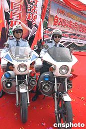 《中華人民共和國道路交通安全法》五月一日正式實施。四月二十五日,十余萬北京民眾走上街頭宣傳這一法規。威武的警員成為龐大宣傳隊伍中最為吸引人目光的焦點。中新社記者:任海霞