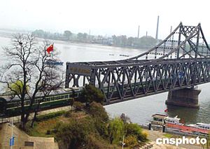 中國(guó)丹東一列通往朝鮮平壤的客運(yùn)火車,四二十五日上午通過鴨綠江上的中朝友誼大橋出關(guān)開往平壤。中新社記者:宋吉河