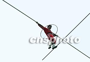 “高空王子”阿迪力唯一傳人沙特爾五月一日起在廣州香江野生動物世界挑戰吉尼斯世界紀錄。這位十五歲的維吾爾族少年將在虎山上空度過二百小時,挑戰生存極限。圖為小伙子在鋼絲上表演呼啦圈。作者:梁永強