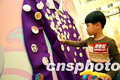5月6日,香港小朋友在海港城舉辦“母親節率先表愛意”活動,將徽章掛在巨型衣服上,慶祝母親節。作者:洪少葵