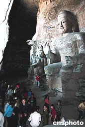 5月8日,游人們?cè)谑澜缥幕z產(chǎn)山西省大同云岡石窟群前游玩。石窟群里雕刻精美的佛像、巧奪天宮的木制建筑和美輪美奐的壁畫,一直吸引著世界各地的游客前來觀光。作者:陳帆