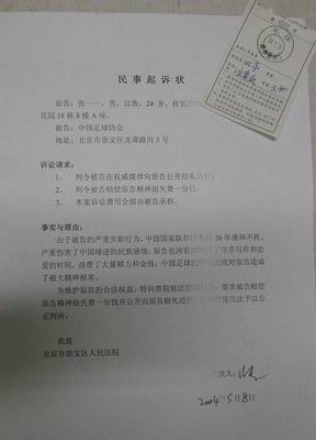 目前,他已聘請了知名律師,寫好了起訴狀書,要求法院判決中國足協賠償他一分錢的精神損失費,“我已經于8日下午向北京市崇文區人民法院立案庭以掛號信的方式遞交了起訴書!”