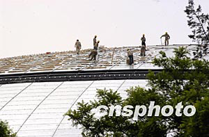 五月初,地處北京市中心的國家大劇院建筑工地上,建筑工人在雨季來臨前站在建筑穹體表層,加緊安裝金屬保護(hù)結(jié)構(gòu)。該建筑由國家財(cái)政投資三十億元興建,目前穹頂建筑施工是該建筑最具難度的施工項(xiàng)目之一。中新社記者:鄒憲