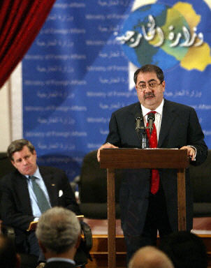 伊拉克臨時(shí)政府外交部長茲巴里則(右)在權(quán)力移交儀式上發(fā)表講話