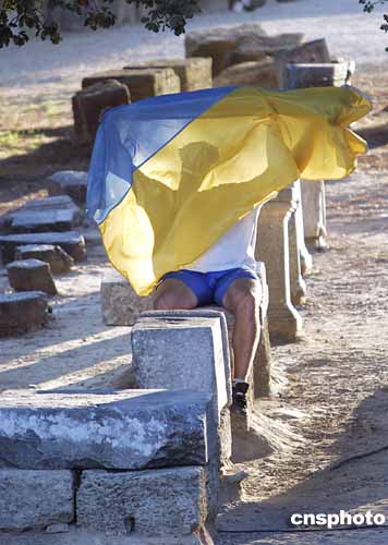 當地時間8月18日,烏克蘭選手比洛諾格獲得男子鉛球比賽冠軍后,獨自一人披著國旗坐在雅典遺留的古廢墟之中。