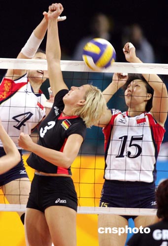 中新社雅典八月二十日電 中國(guó)女排在奧運(yùn)會(huì)女排預(yù)賽第四輪中憑借穩(wěn)定的發(fā)揮以三比0輕松戰(zhàn)勝德國(guó)隊(duì)。