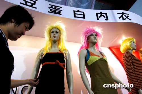 初秋的北京,國內外七十多家內衣生產廠商齊聚國際展覽中心,參加“中國國際內衣博覽會”,他們或從外觀展示時尚美麗,或從內質強調親膚舒適。北京一家內衣商展示大豆蛋白纖維內衣,據知,中國擁有大豆蛋白纖維新技術的自主知識產權。中新社記者:王麗南