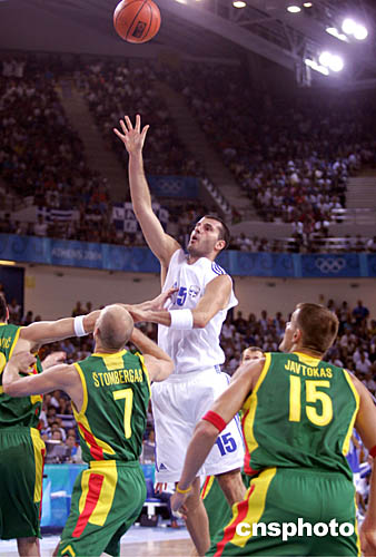 在當(dāng)?shù)貢r間8月19日舉行的希臘與立陶宛的籃球比賽中,立陶宛15號選手Robertas JAVTOKAS高高跳起為搶籃板。