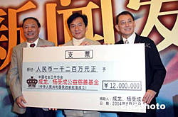 八月二十一日,成龍、楊受成公益慈善基金在北京人民大會堂成立。國際著名影星成龍和香港英皇集團主席楊受成捐助一千二百萬元人民幣為創始基金,用于中國老人、婦女、兒童、及貧困人員的公益慈善事業。中新社記者:史利