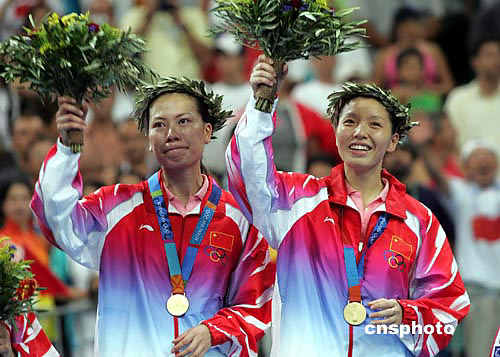 中新網8月21日電 在剛剛結束的雅典奧運會羽毛球女子雙打決賽中,中國選手張潔雯/楊維以2:1戰勝隊員高崚/黃穗,使中國代表團再增一枚金牌和一枚銀牌。三局的比分分別為7:15、15:4和15:8。