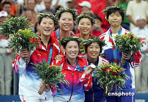 當地時間八月二十一日下午,中國選手楊維、張潔雯與高崚、黃穗分獲雅典奧運羽毛球比賽女子雙打冠、亞軍。中新社記者:毛建軍