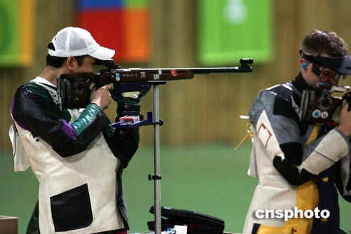 當(dāng)?shù)貢r(shí)間八月二十二日下午,在雅典奧運(yùn)會(huì)男子三乘四十射擊比賽中,中國的賈占波以一千二百六十四點(diǎn)五環(huán)的成績獲得金牌。中新社記者:毛建軍