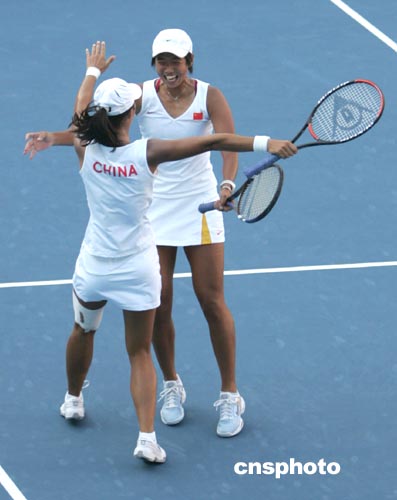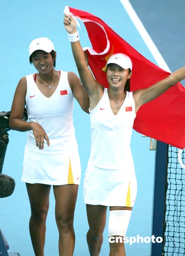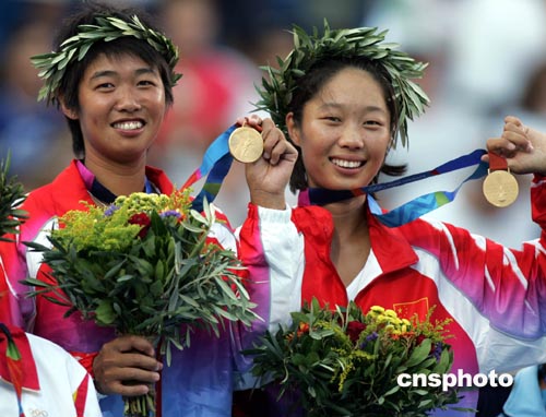 雅典時間8月22日傍晚,中國網球選手孫甜甜、李婷(左)在奧運會女子雙打決賽中以二比零戰勝西班牙選手,令人震驚地獲得冠軍。中新社記者:任晨鳴
