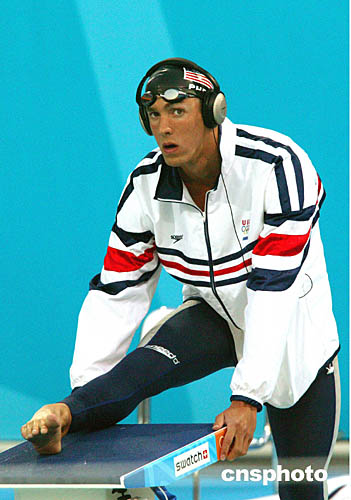 圖為獲得男子100米蝶泳冠軍的美國選手菲爾普斯(Michael Phelps)在做賽前準備活動。