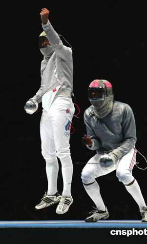 在當地時間19日舉行的男子佩劍團體三、四名決賽中,俄羅斯選手Serguei Charikov(左)在戰勝美國選手Ivan Lee后,表現十分激動。