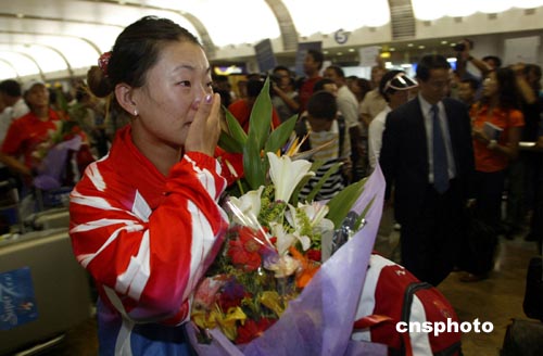 8月23日,參加雅典奧運(yùn)會的中國射箭隊(duì)主力隊(duì)員何影回到北京,在首都國際機(jī)場受到人們的熱烈歡迎。中新社記者:盛佳鵬
