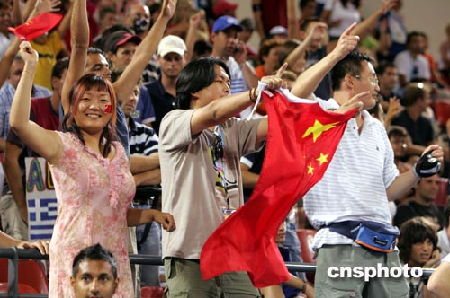當(dāng)?shù)貢r(shí)間8月23日下午,中國男籃在雅典奧運(yùn)會(huì)小組賽最后一場比賽中以67比66險(xiǎn)勝世界冠軍塞黑隊(duì),闖入前八名。圖為到場觀戰(zhàn)的中國球迷欣喜異常。中新社記者:任晨鳴