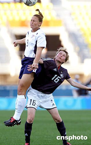 圖為在當地時間8月23日的女足比賽中,美國隊3號選手Christie RAMPONE頭球出色。