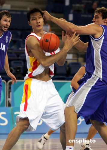 中國男籃在雅典奧運會小組賽最后一場比賽中以一分險勝世界冠軍塞黑隊闖入前八名,首發新星易建聯(白衣)上場僅三分多鐘,狀態依然低迷。賽前被各界一直看好的易建聯不滿十七歲,被視為最有前途的新星。或許是年輕和缺乏經驗,易建聯的表現令人失望,包括到場的眾多NBA球探和經紀人。中新社記者:任晨鳴